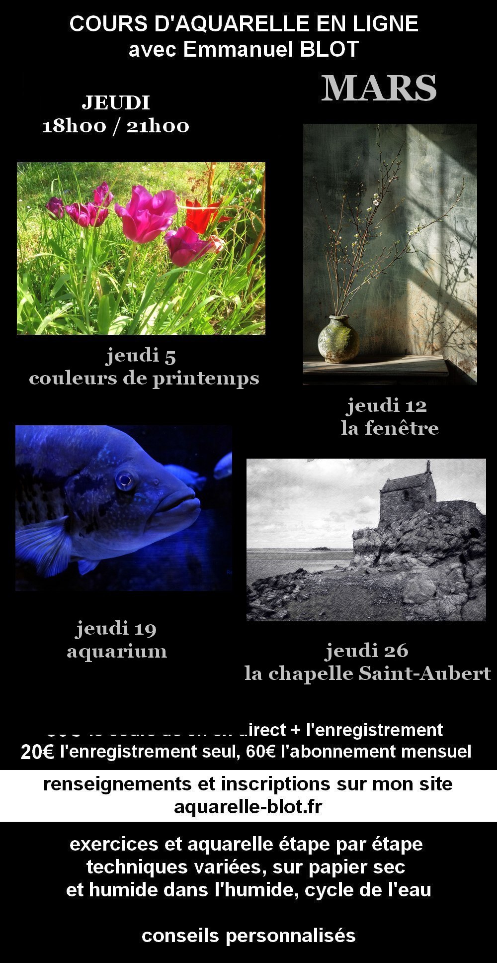 Les thèmes sont très variés, le paysage, le portrait, la nature morte, les fleurs, les animaux, l’art abstrait et bien d’autres sujets qui vous transporteront dans la lumière et la magie de l’aquarelle tout en gardant une exigence pédagogique autour des notions picturales essentielles comme la lumière, la composition, l’harmonie des couleurs et les textures.